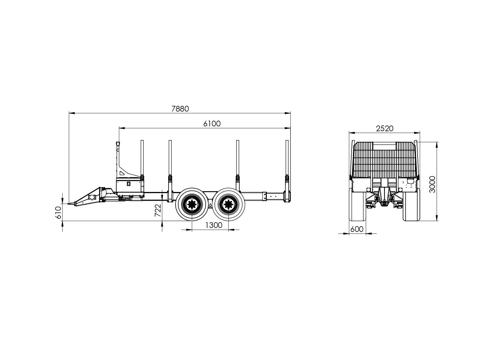 A rakodófelület mérete 2,2–2,5 m², amely elegendő helyet biztosít a rönkök biztonságos elhelyezéséhez. A pótkocsi kialakítása lehetővé teszi különböző erdészeti kiegészítők, például daru vagy egyéb opciók integrálását is, így a gép könnyen az adott felhasználási igényekhez igazítható.