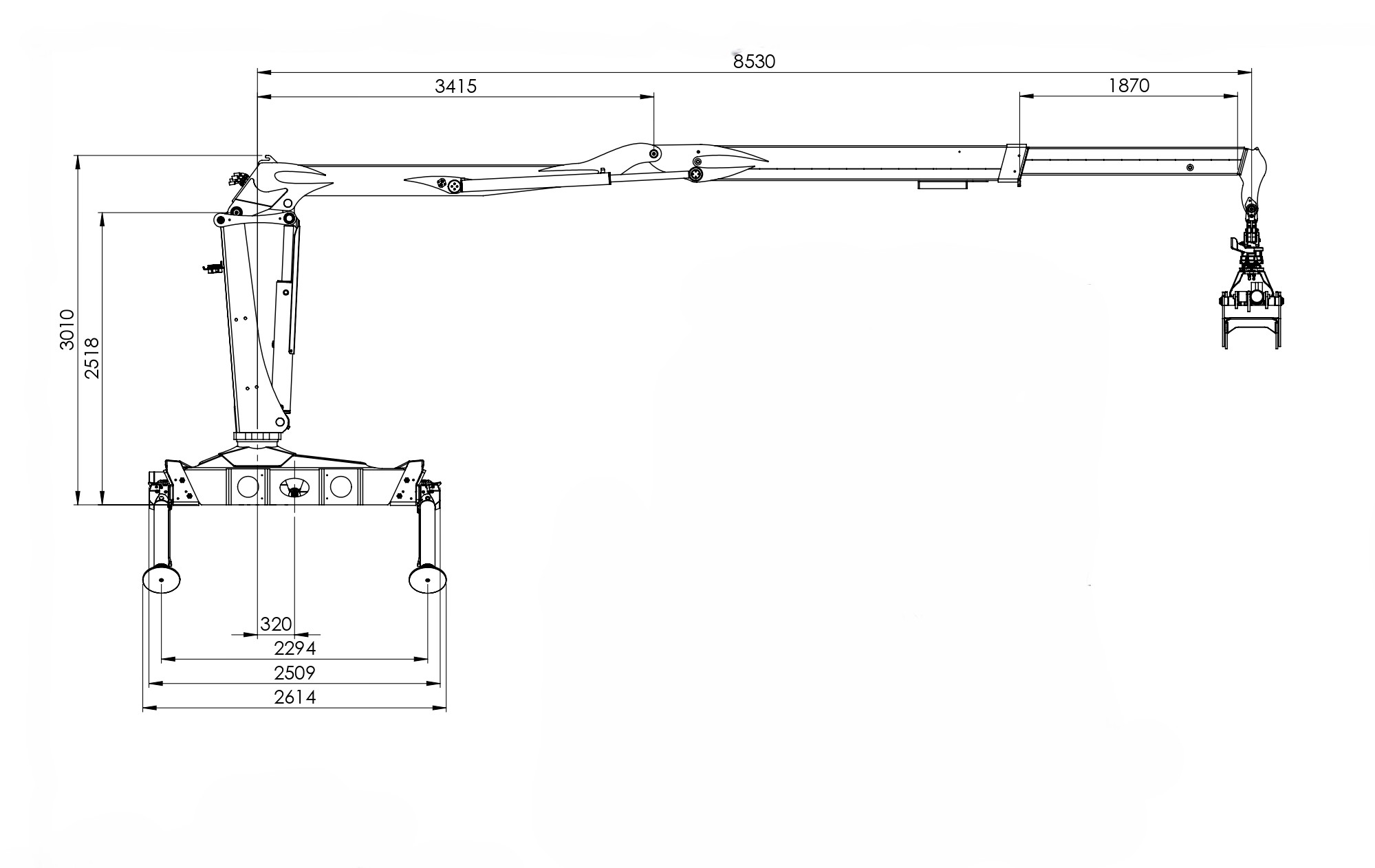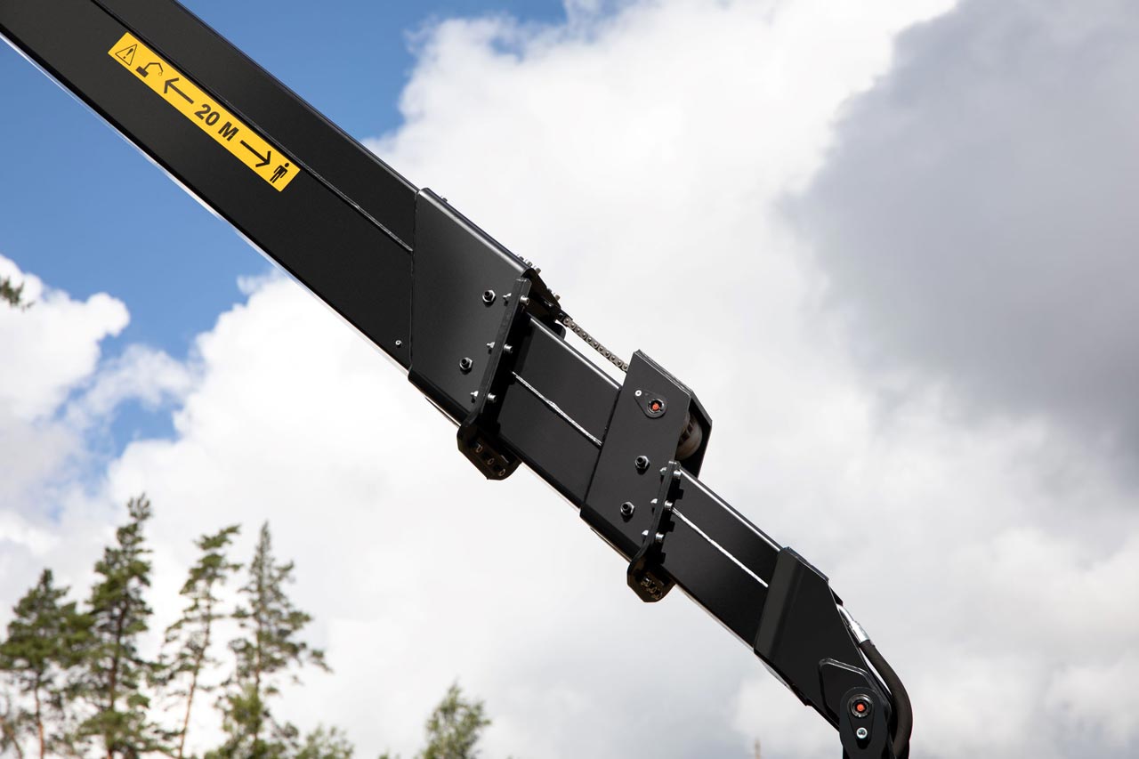 A daru 8,6 méteres maximális kinyúlással és akár 162 kNm emelési nyomatékkal rendelkezik, amely jelentős emelési kapacitást biztosít nagyobb rönkök kezelésekor is. Teljes kinyúlásnál a daru akár 1200 kg emelésére is képes (markoló és rotátor nélkül), ami kiváló teljesítményt jelent a kategóriájában.